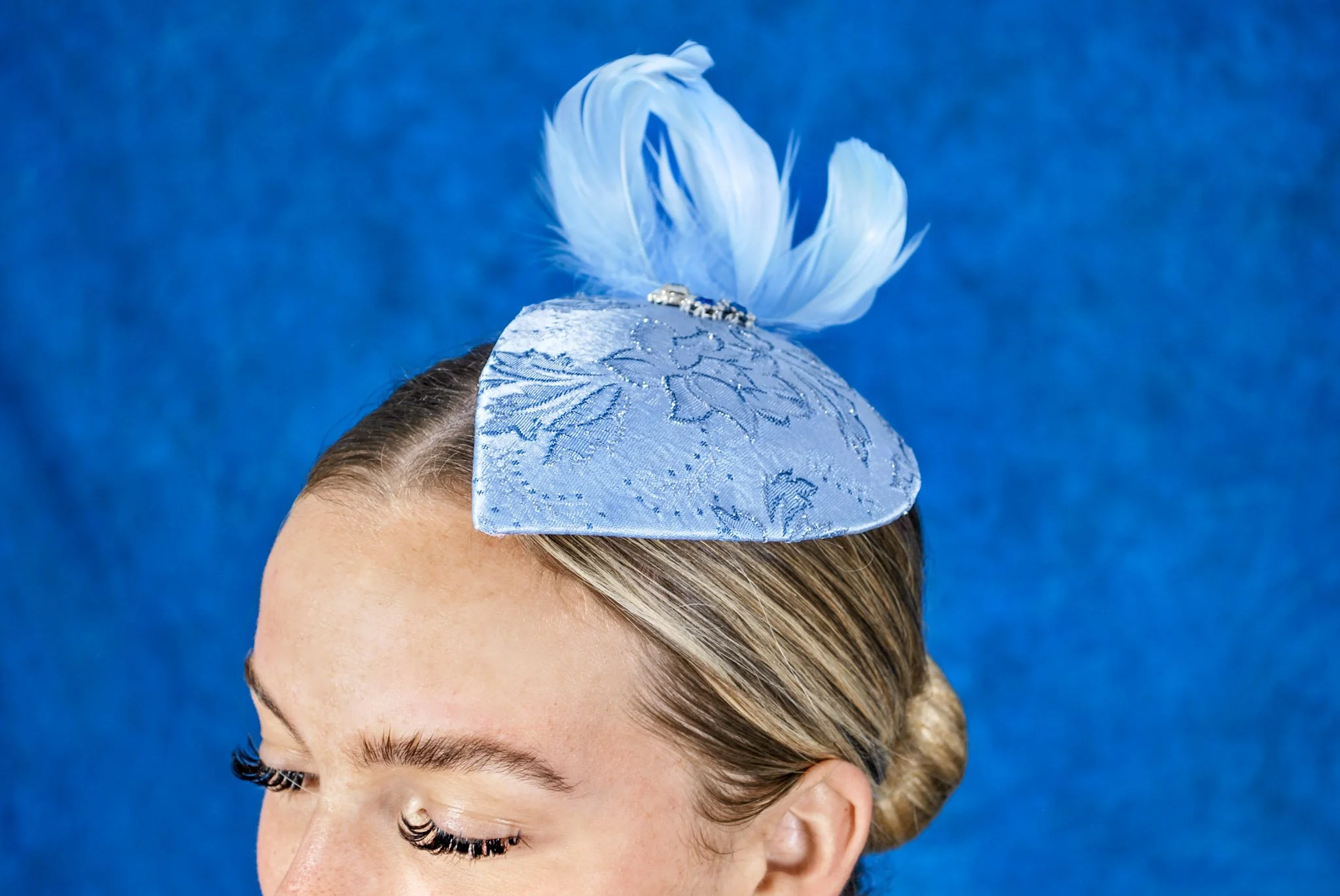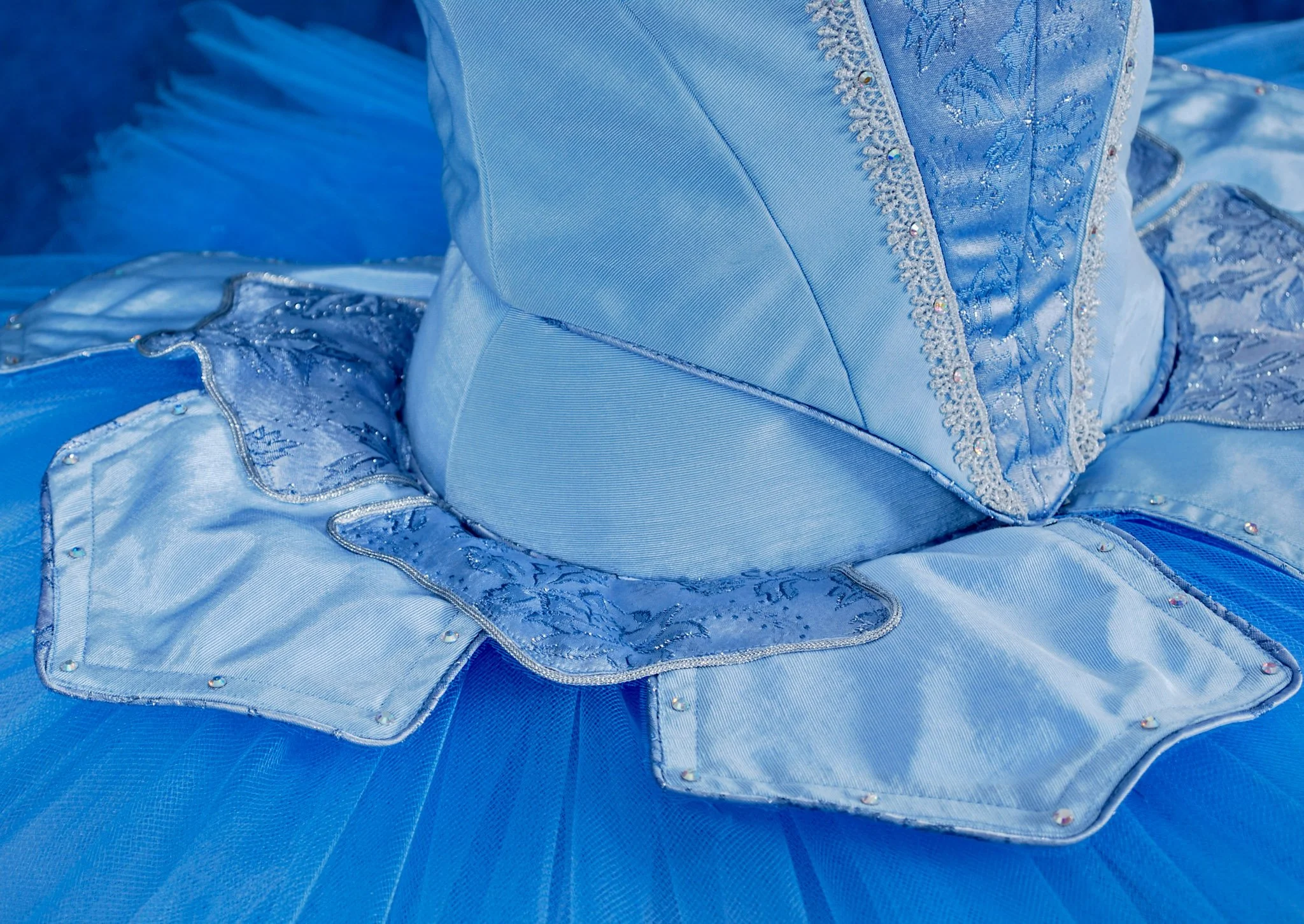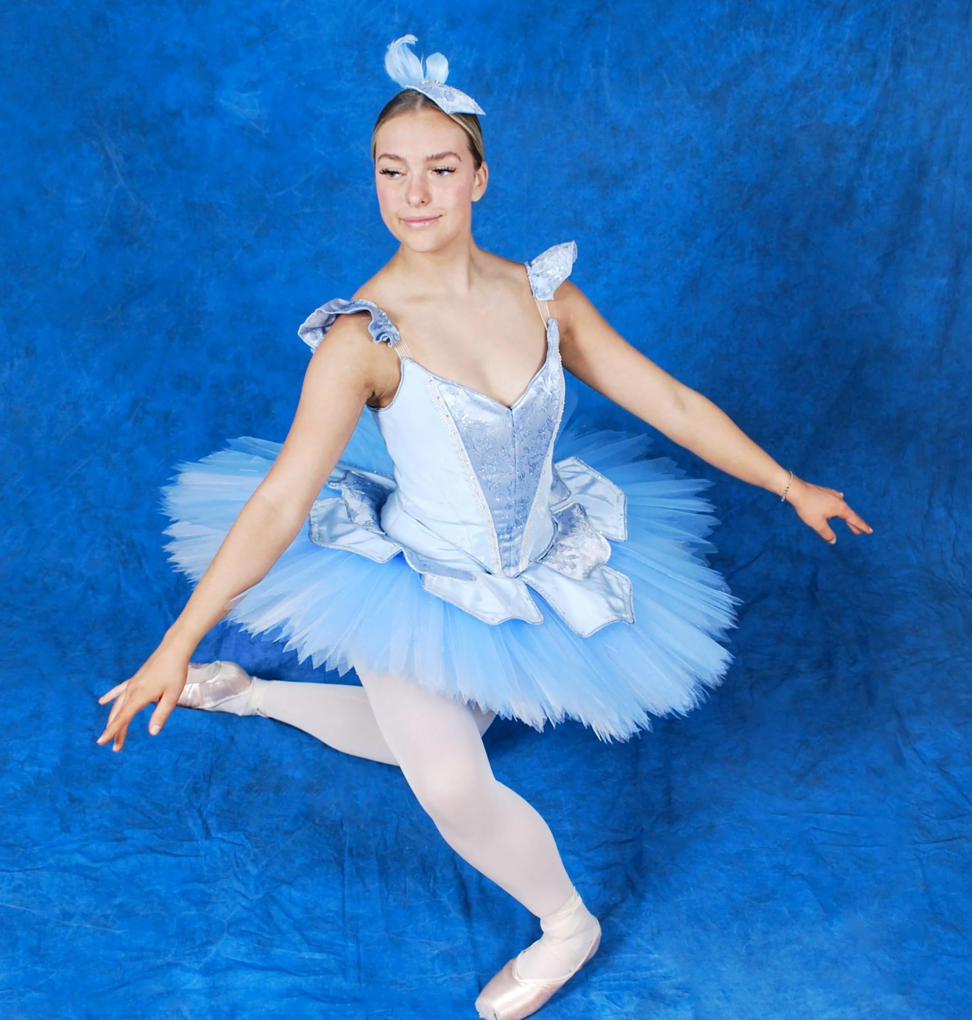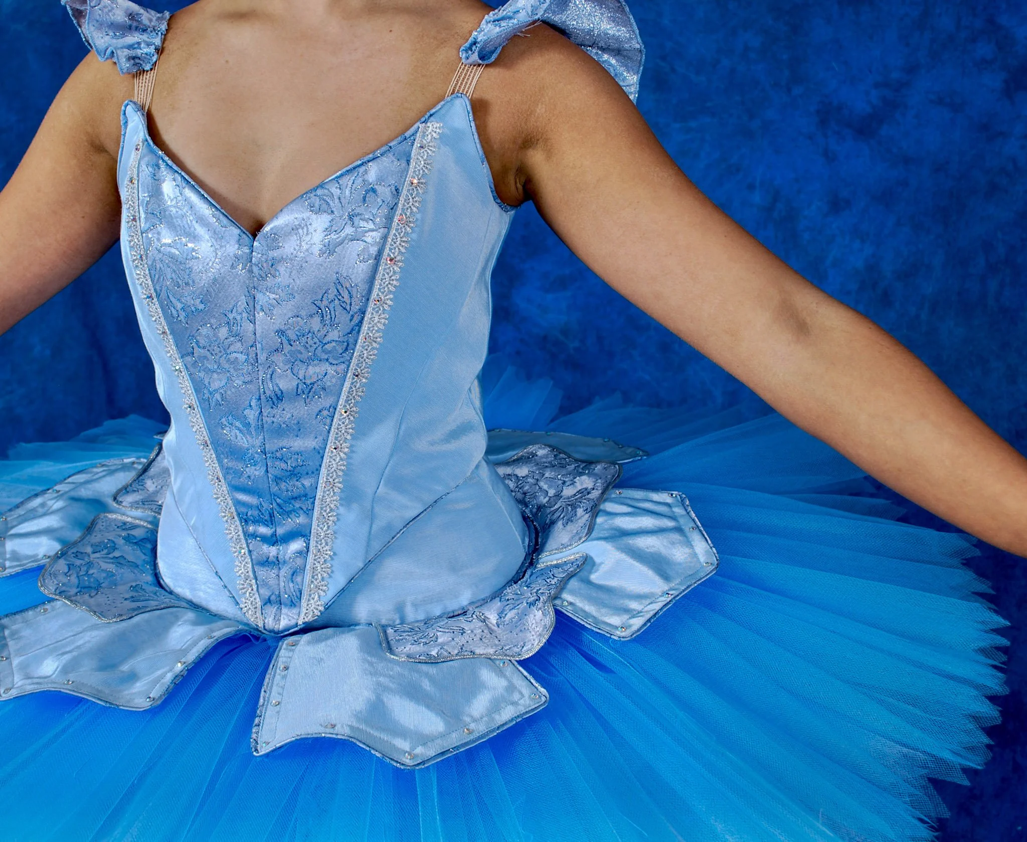 This dreamy blue tutu is perfect for Princess Florine. This costume features a 10 piece bodice made from blue bengaline and metallic brocade, a 10 layer hand-tacked and dagged tutu in alternating layers of blue and white, and a sweet little flutter sleeve set on nude elastic. The costume has silver lace accents and a hint of sparkle from Swarovski rhinestones. Rental includes a teardrop hat trimmed with blue feathers.
