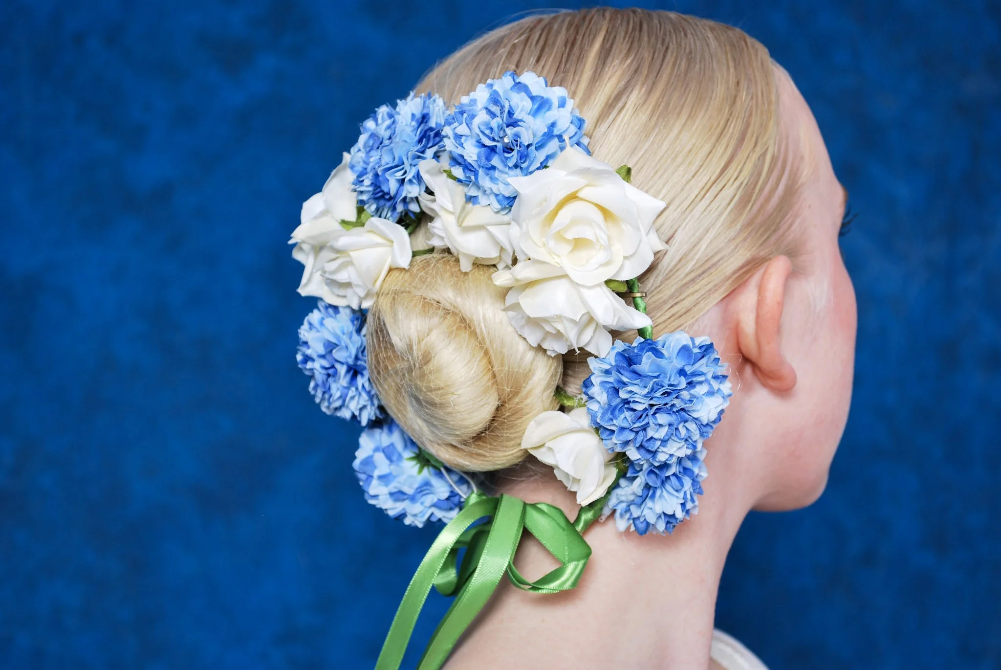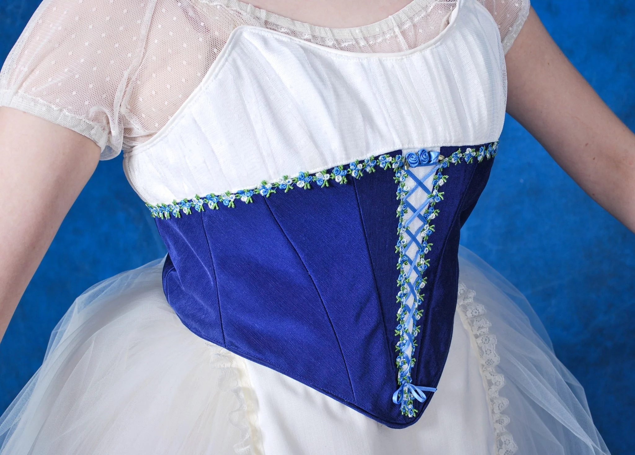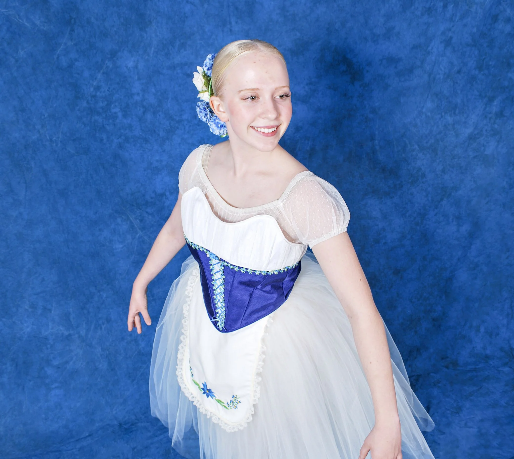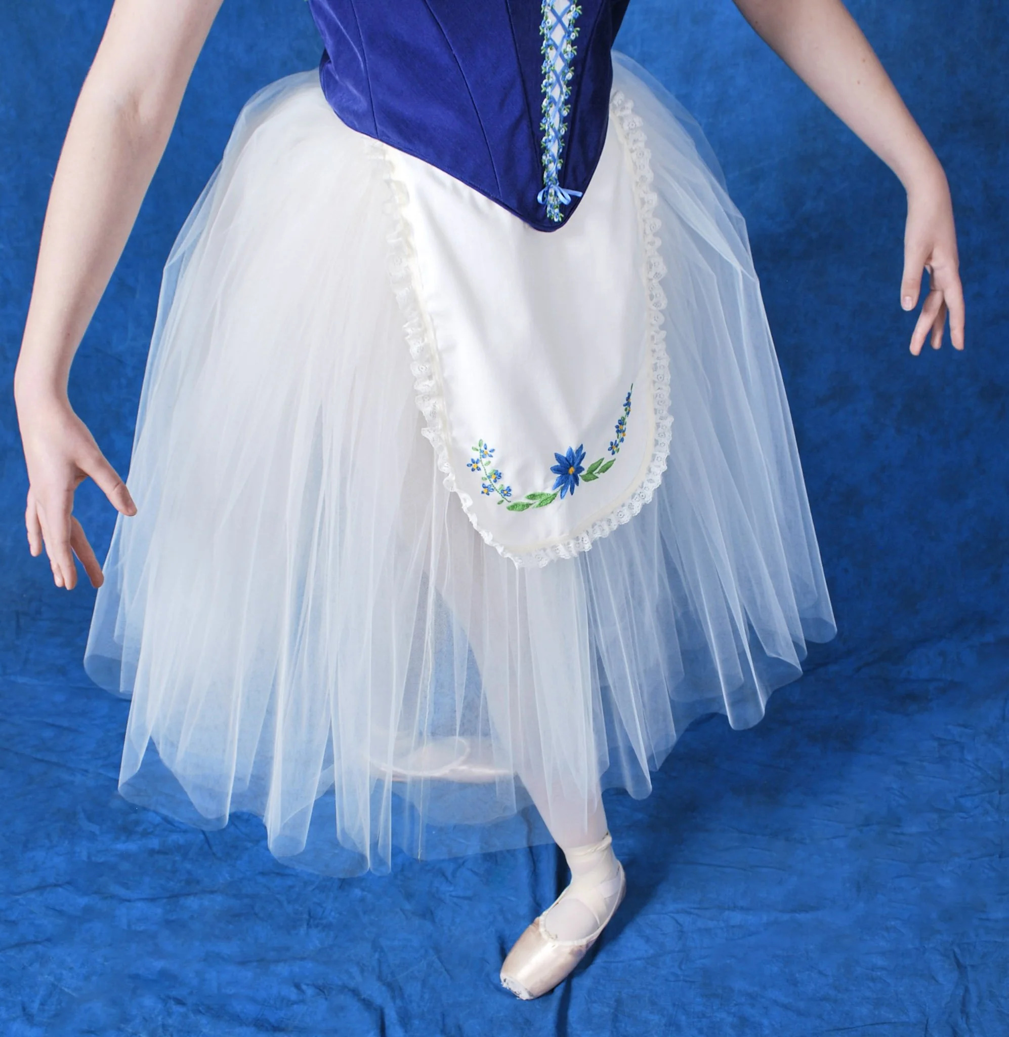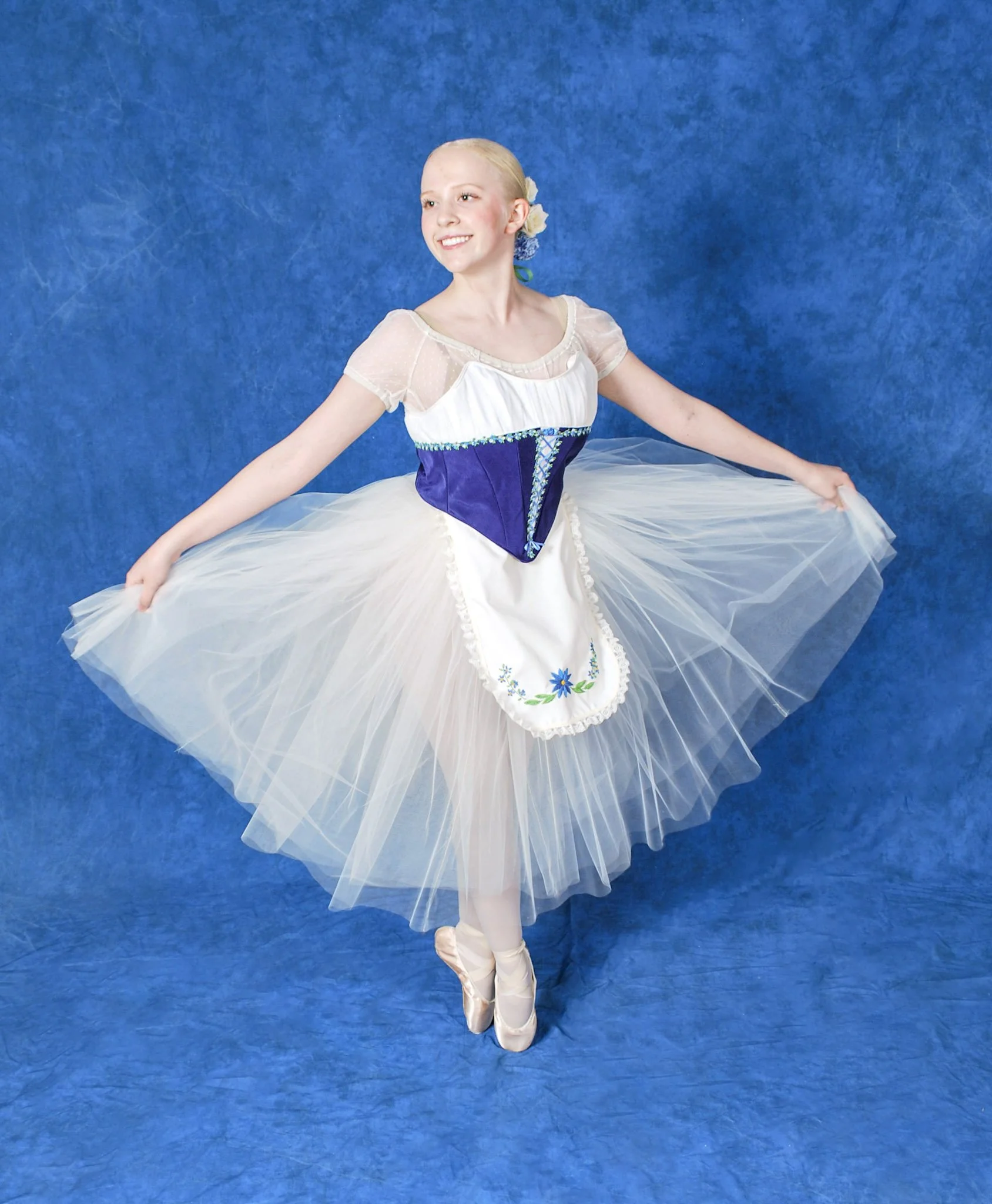 This sweet peasant dress is perfect for Giselle or any other village role. The 10 piece navy bengaline bodice has an attached ivory chemise and corset-look lacing. The Romantic tutu is made from 4 layers of ivory net and tulle. A hand embroidered apron and sweet flower trims finish the look. Rental includes a cream and blue flower wreath.