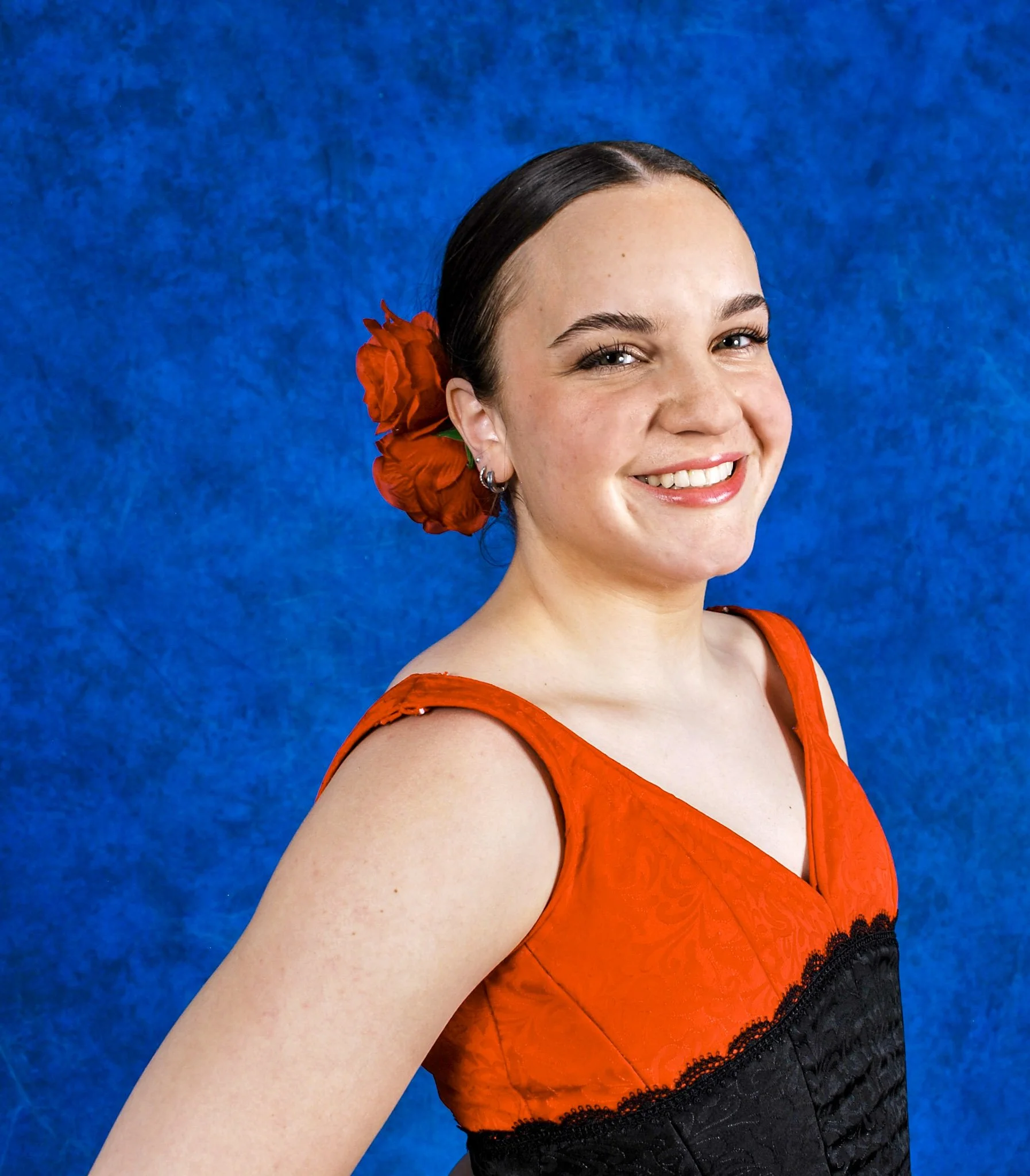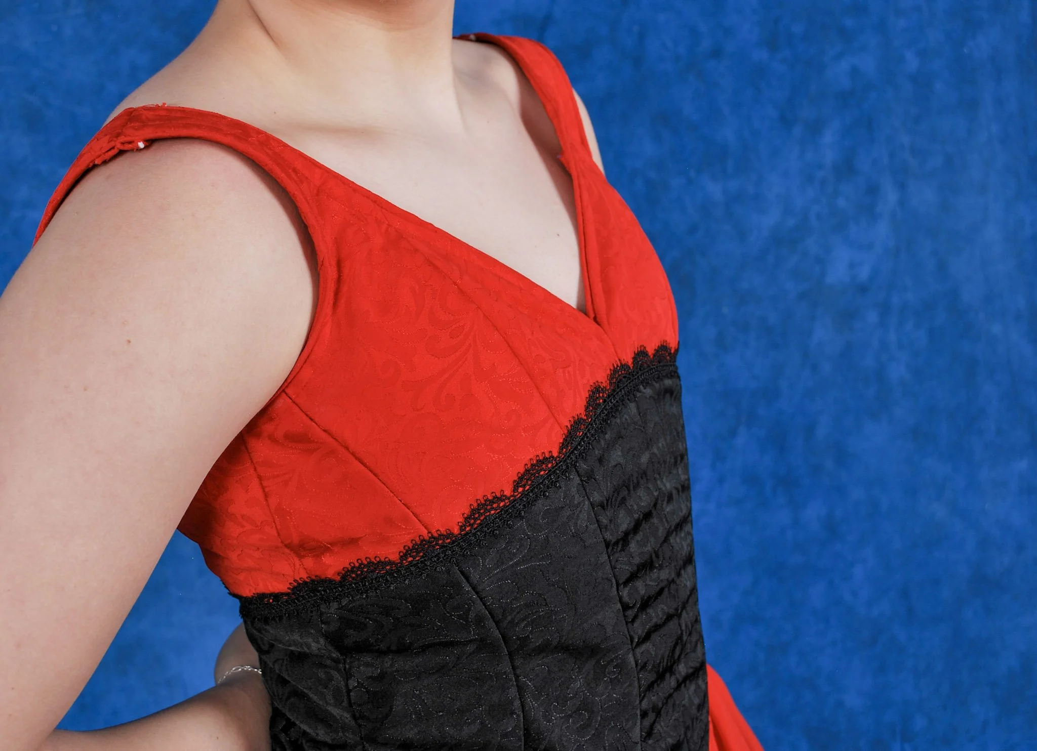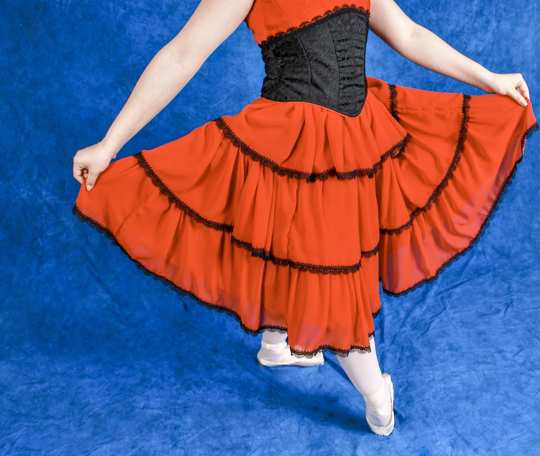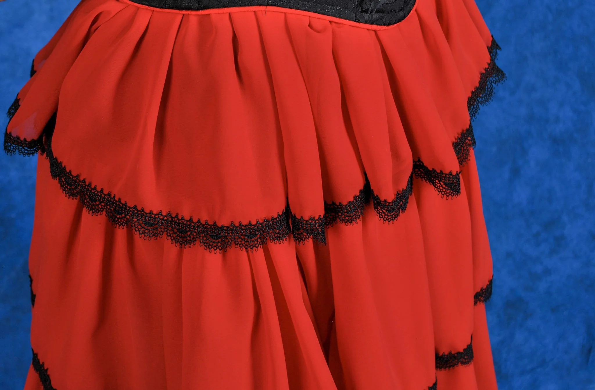 Designed as a beautiful Spanish dress for Kitri in Don Quixote, this beautiful costume would also be perfect for any Nutcracker. The 12 piece two-tone longline bodice is made from red and black jacquard with a touch of black lace. The full circle 3 tiered skirt is made from red chiffon and is backed with red net and trimmed with black lace. Rental includes a rose and bead hairpiece.