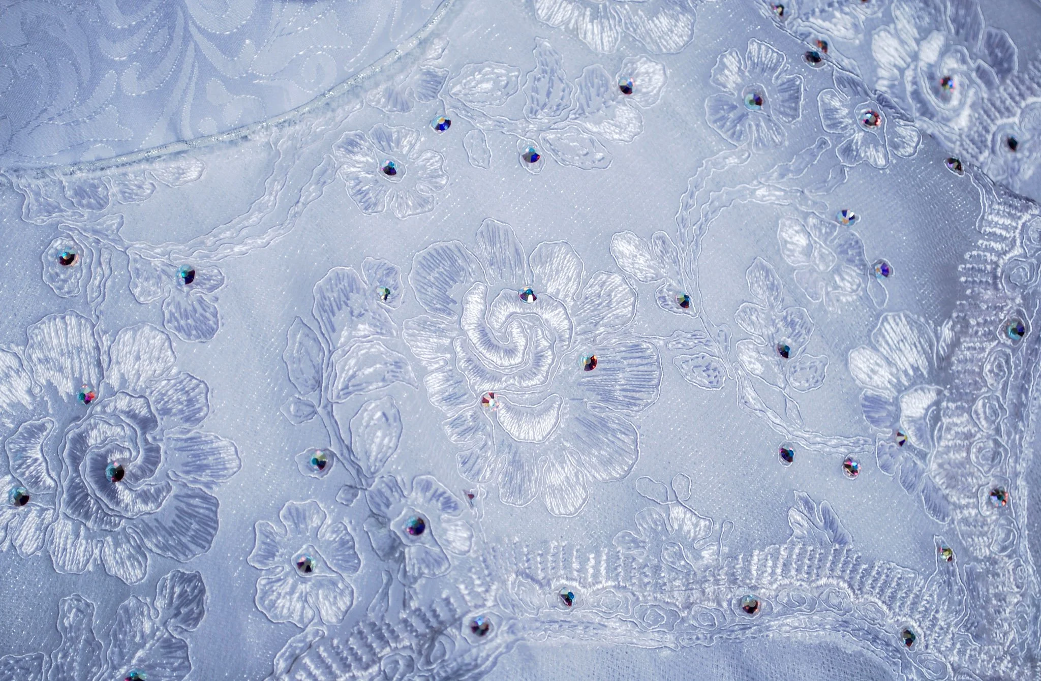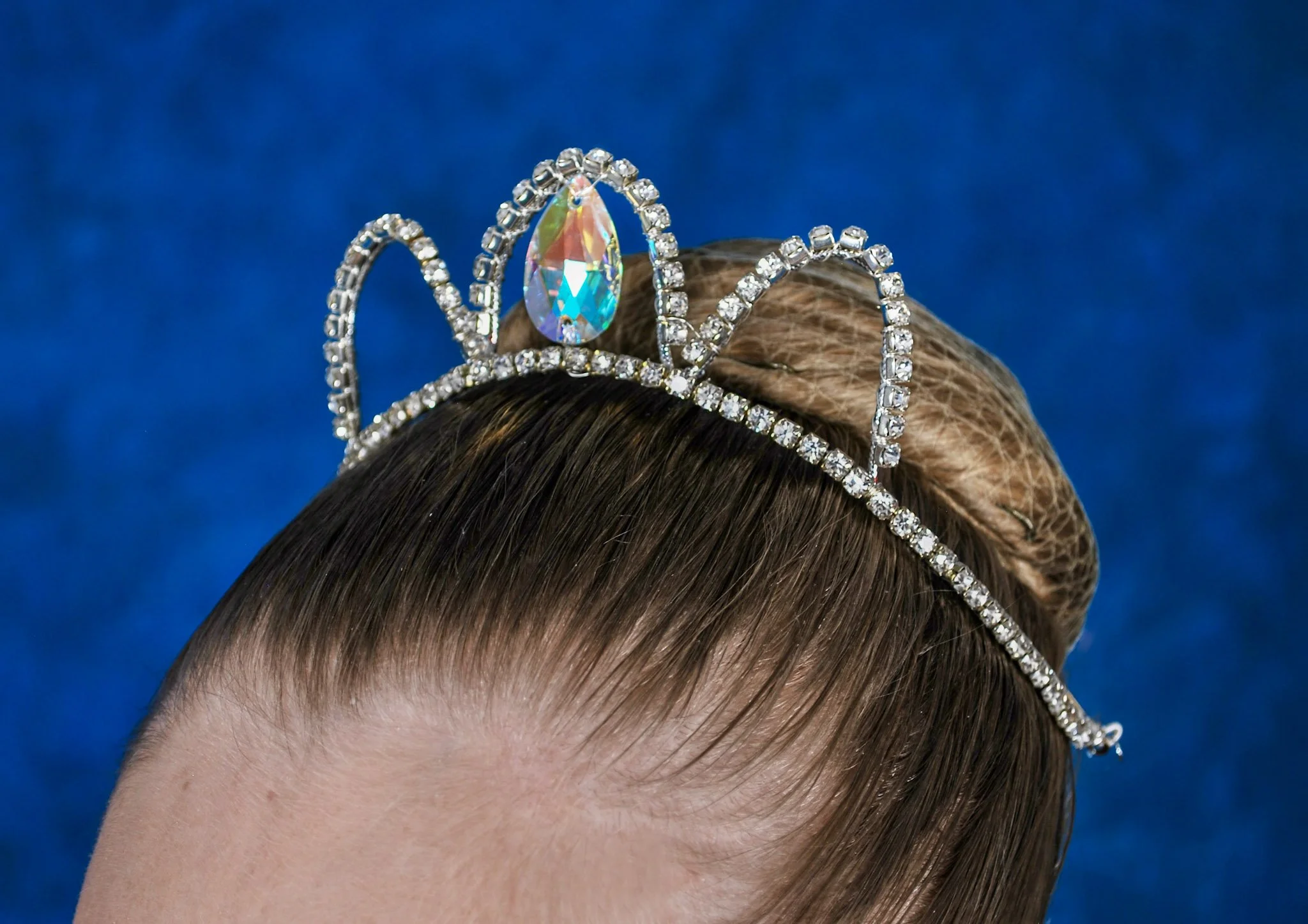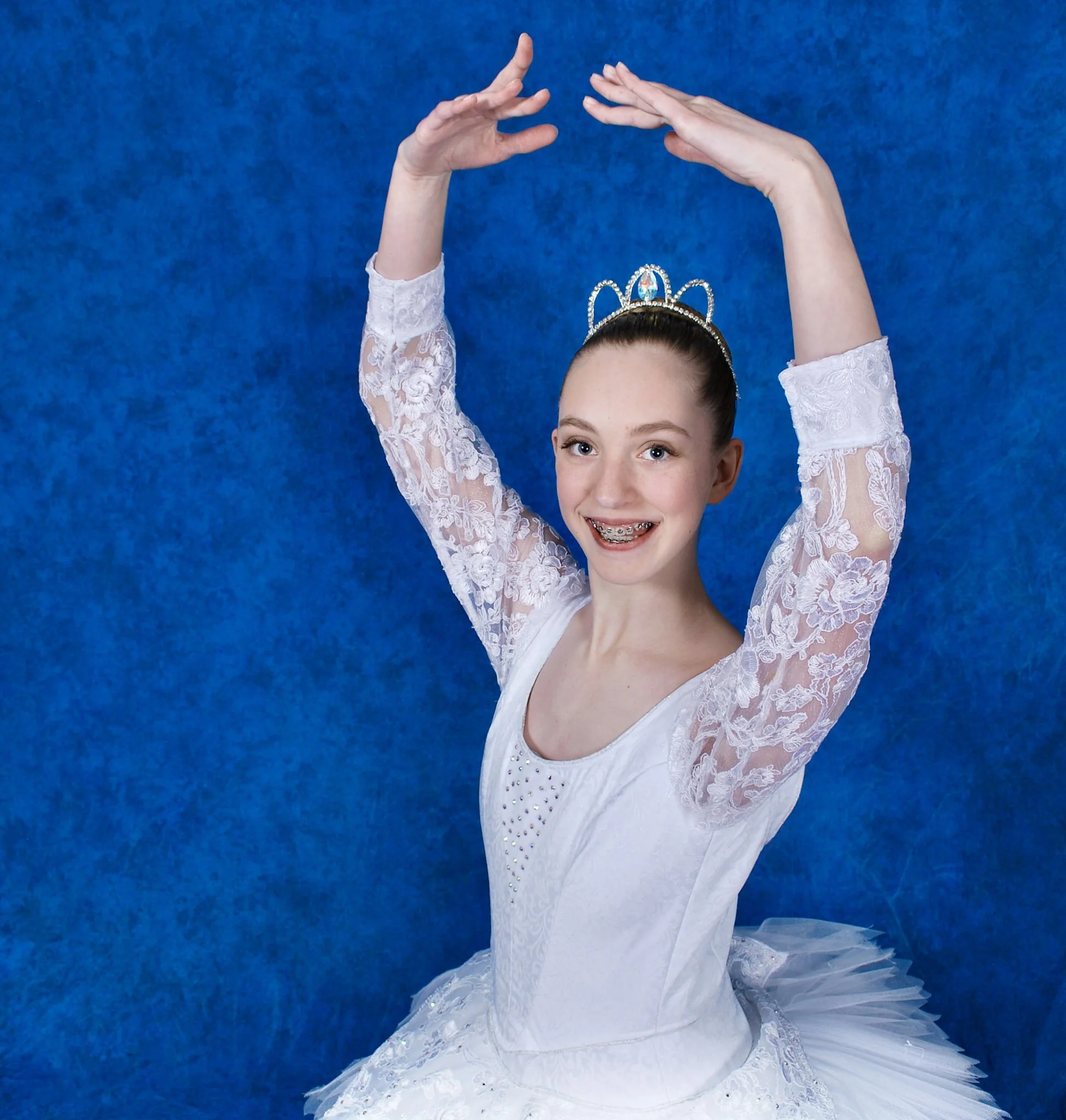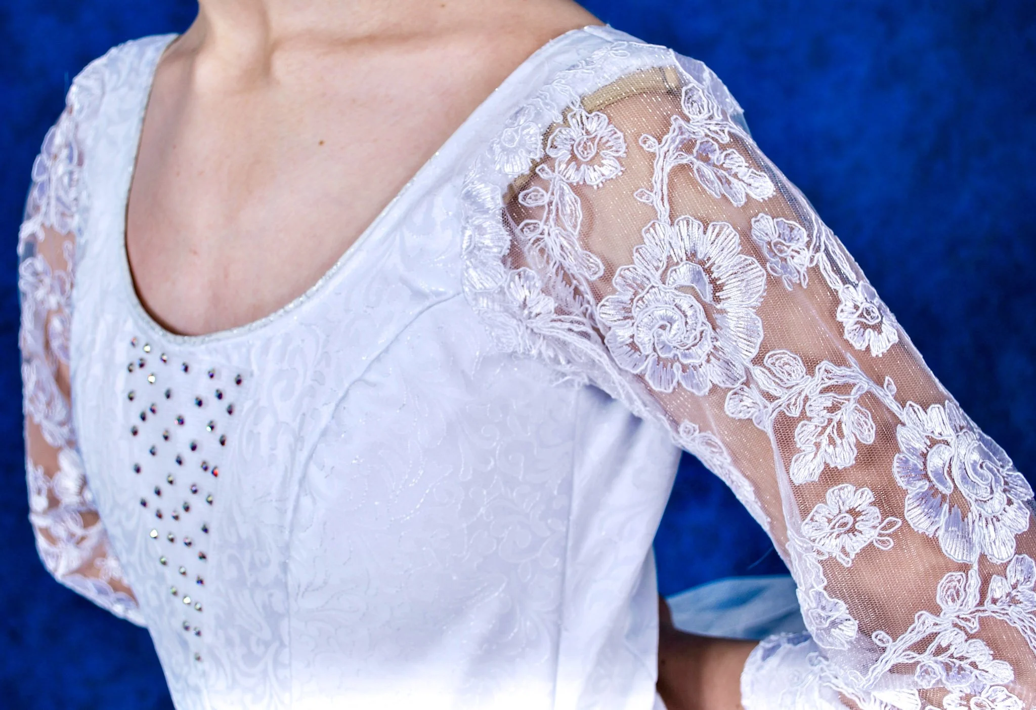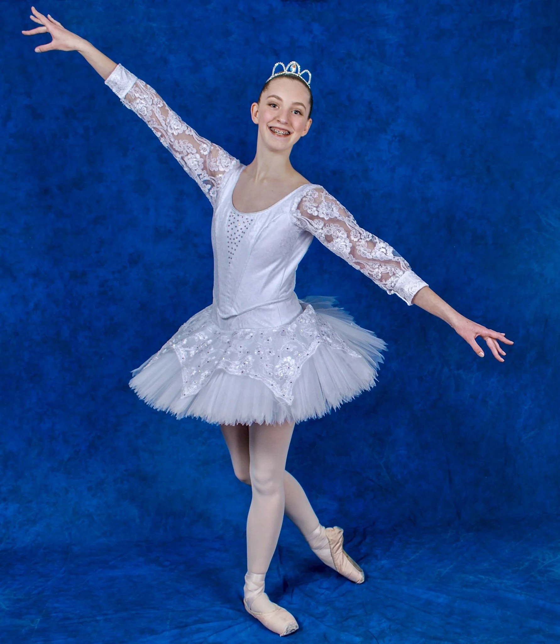 This striking tutu is perfect for your Snow Queen, or any royal role. The costume features an 8-piece bodice made from white jacquard edged with metallic brocade piping. The 10 layer tutu is hooped, hand-tacked, and has delicate dagged edges. A white lace plate, white lace sleeves, and lots and lots of rhinestones complete the look. Rental includes a simple but sweet rhinestone tiara.