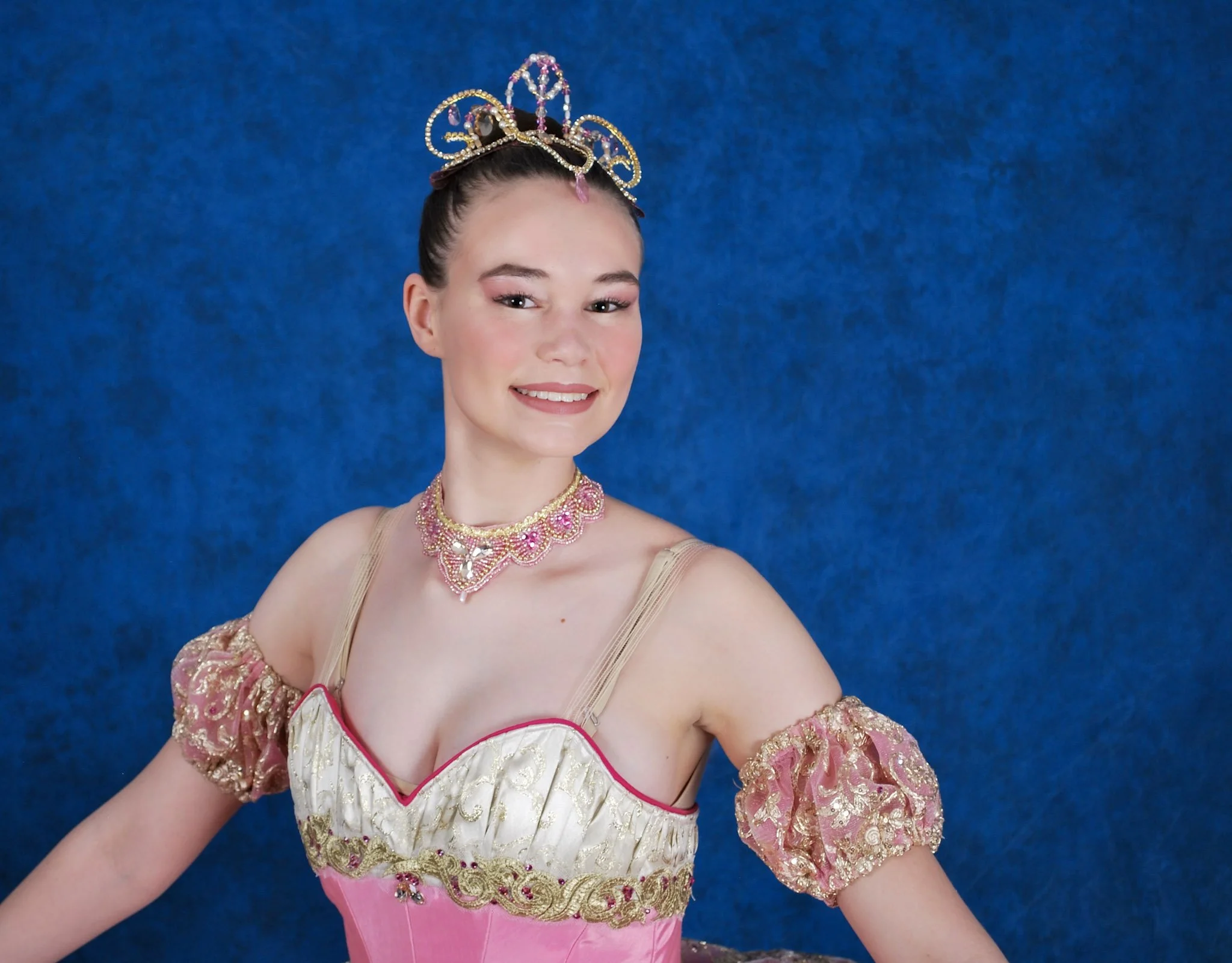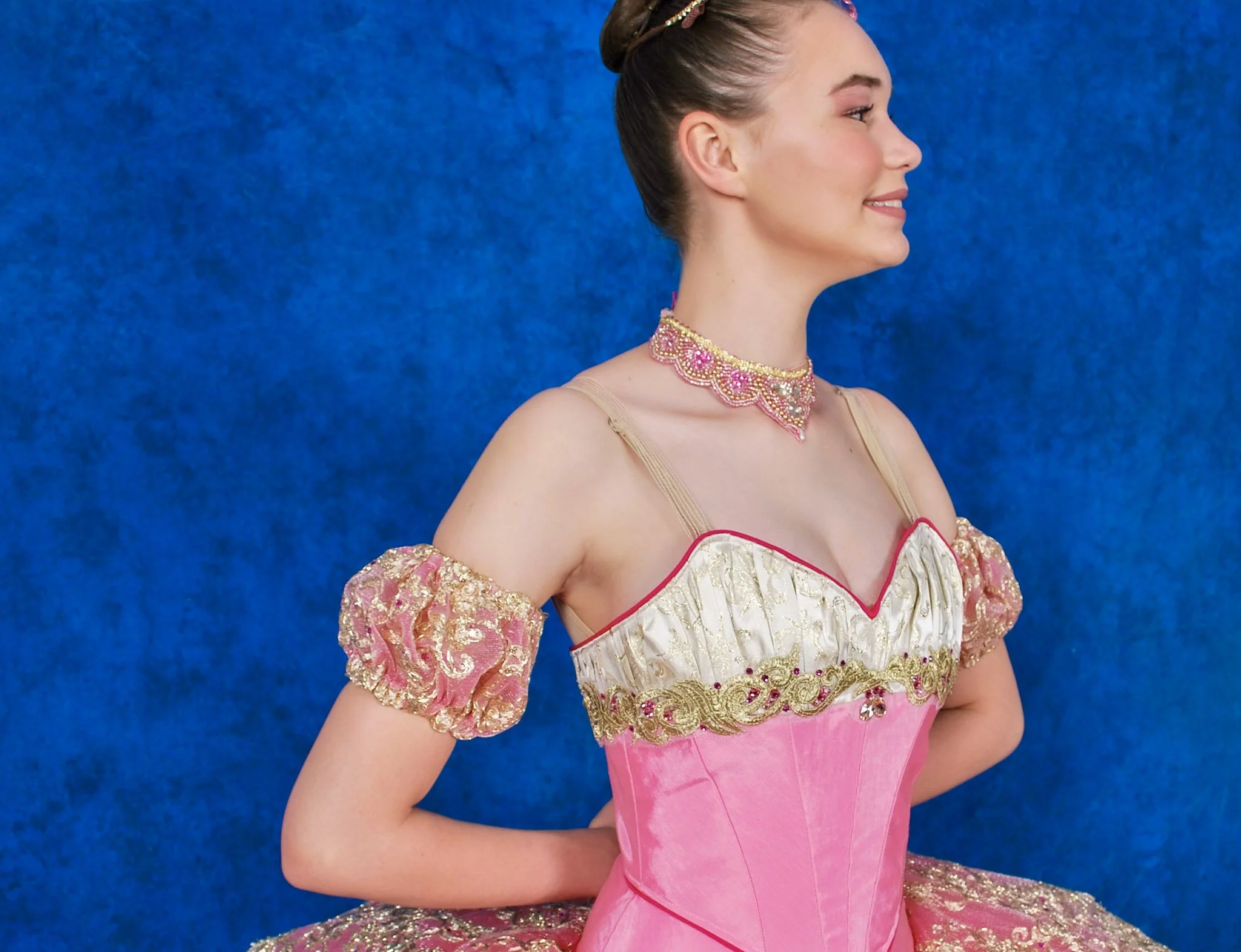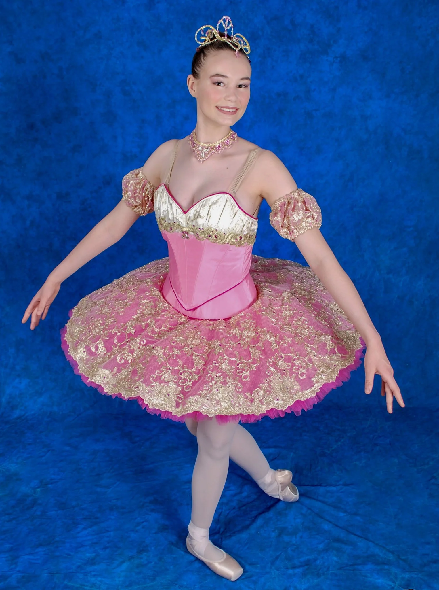 Your Sugar Plum Fairy will feel divine in this gorgeous tutu. The 10 piece two-tone bodice is made from shades of pink bengaline and champagne brocade. The pink tutu has 10 scalloped layers, and is hooped and hand-tacked. Champagne trims, lace, and pink and gold rhinestones complete the effect. Two detached puff sleeves, a necklace, and a tiara are included in the rental.