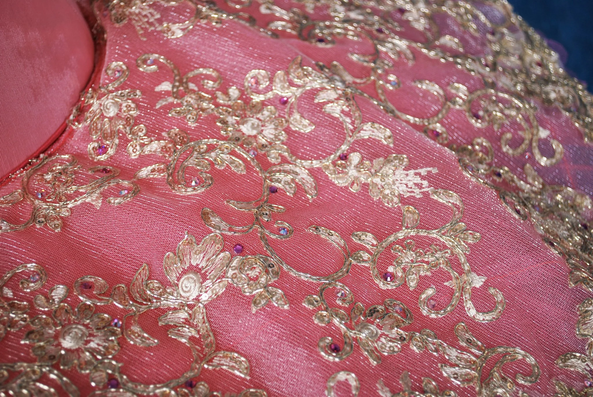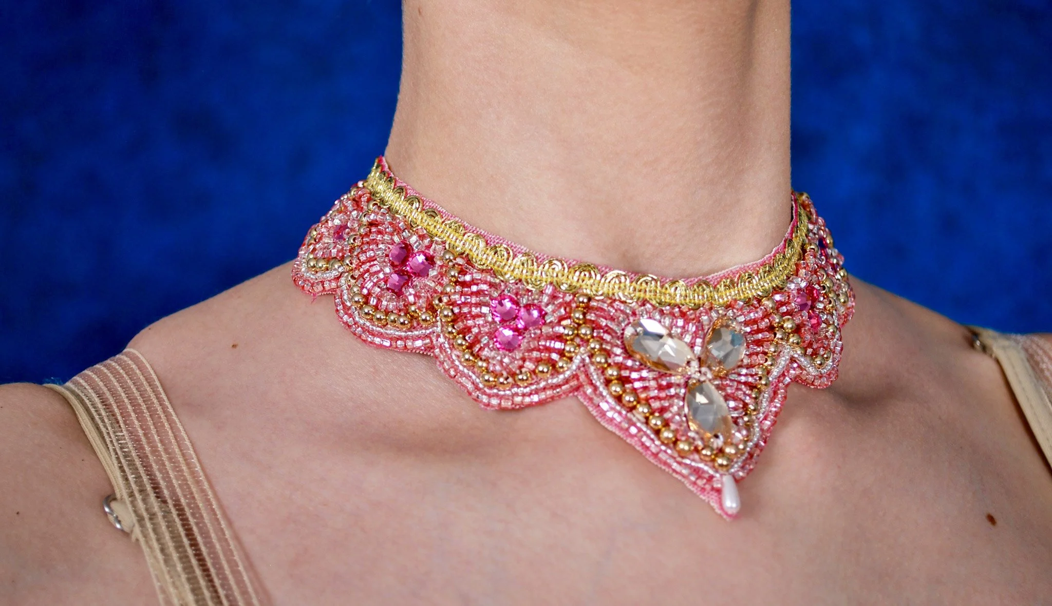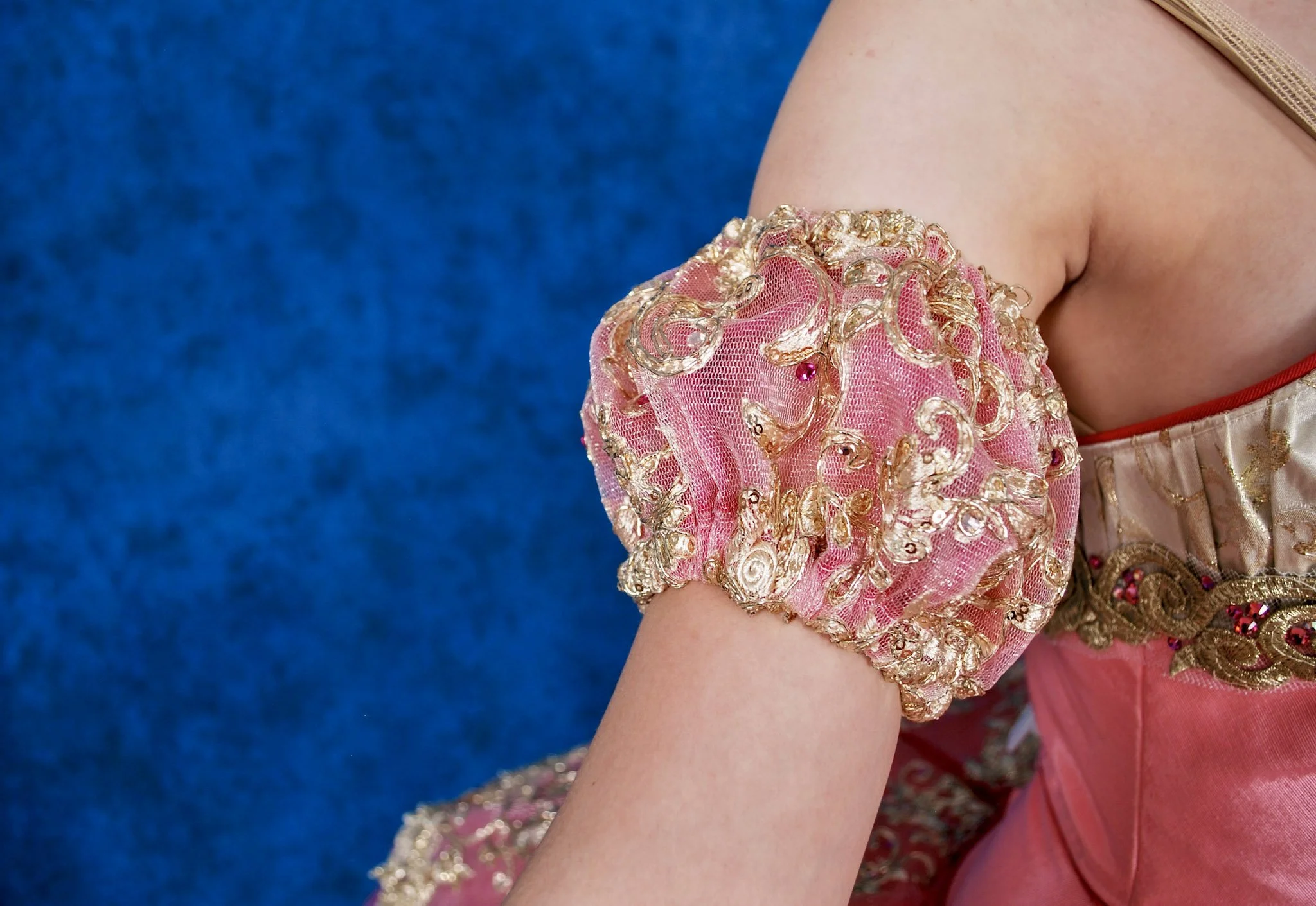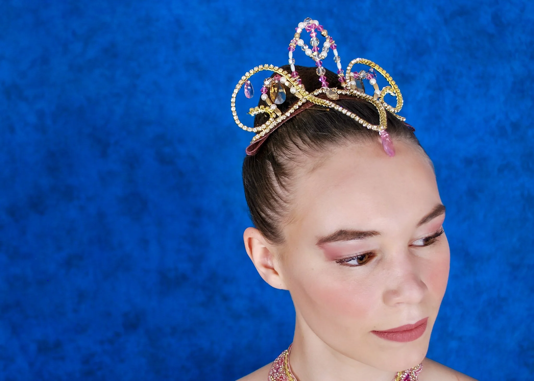 Your Sugar Plum Fairy will feel divine in this gorgeous tutu. The 10 piece two-tone bodice is made from shades of pink bengaline and champagne brocade. The pink tutu has 10 scalloped layers, and is hooped and hand-tacked. Champagne trims, lace, and pink and gold rhinestones complete the effect. Two detached puff sleeves, a necklace, and a tiara are included in the rental.